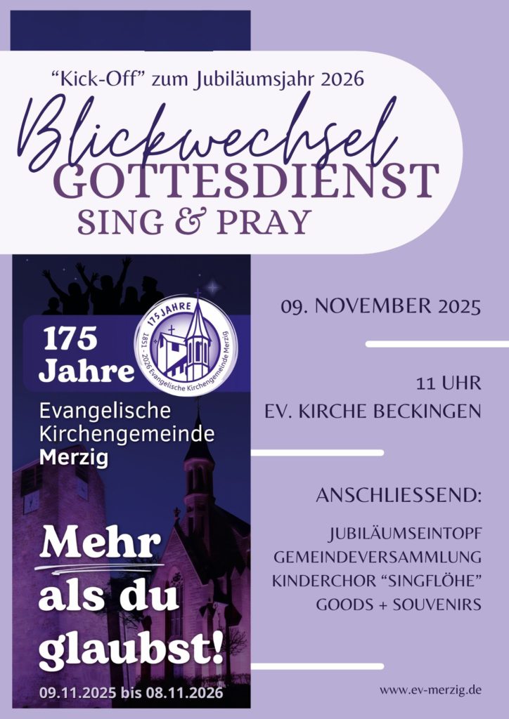 Anfangen wollen wir mit einer „Kick-off“ Veranstaltung, unserem Blickwechsel-Gottesdienst, am 09.11 in der Kirche in Beckingen. Herzliche Einladung!
