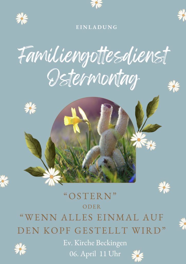 Ostermontag feiern wir einen Familiengottesdienst um 11 Uhr. Thema „Alles steht Kopf“. Manchmal in unserem Leben und Ostern dreht auch viele Dinge einfach mal um…